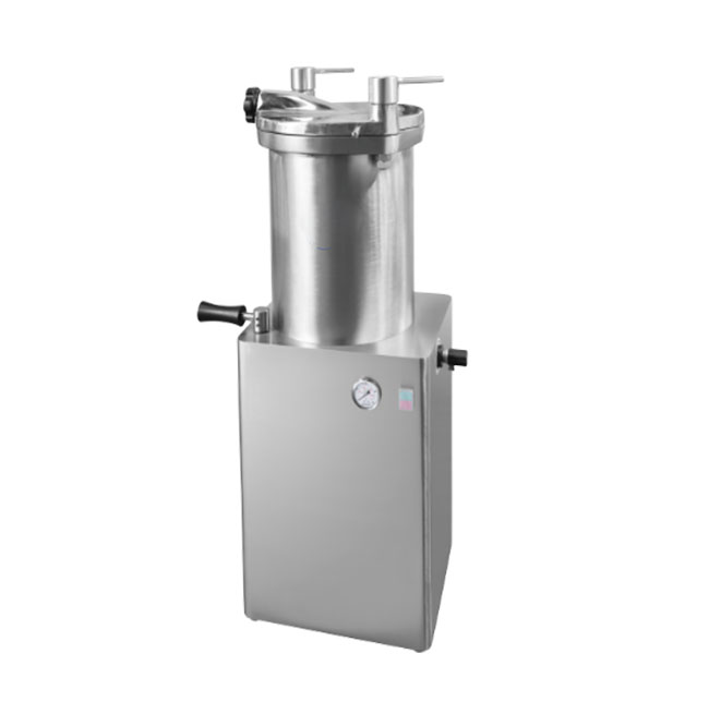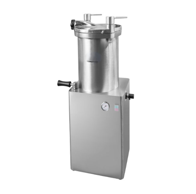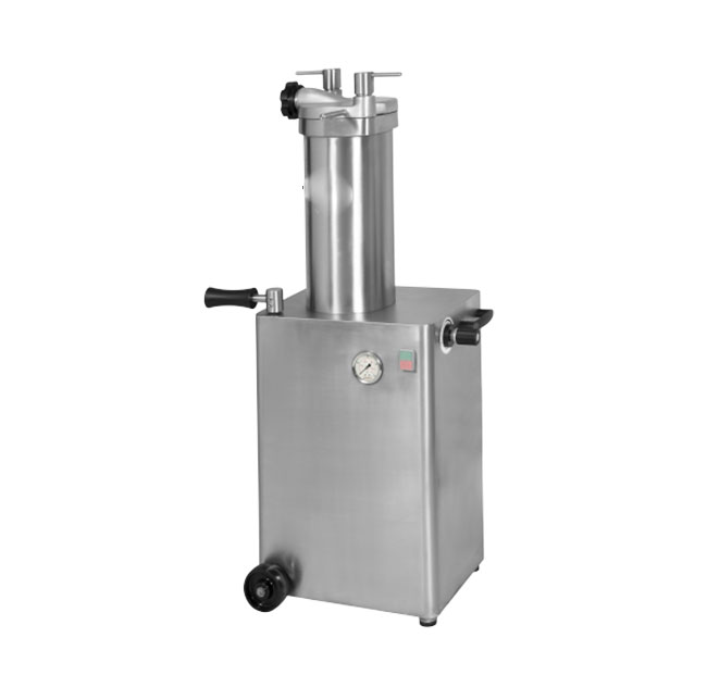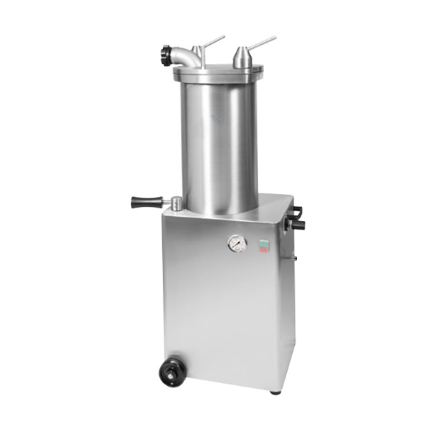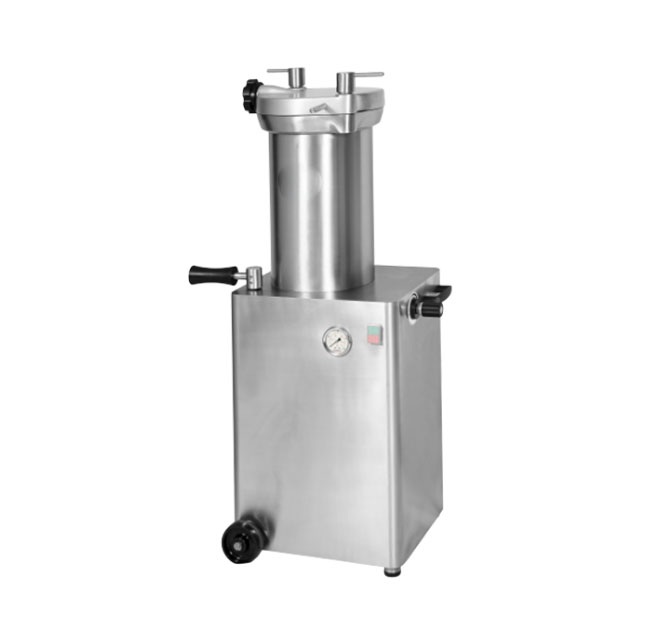 Capacity: 20 liters. Totally manufactured in AISI 304 stainless steel. STAR models with lid and piston in AISI 304 stainless steel. Other models with lid and piston in high quality anodized aluminium. Independent oil tank in AISI 304 stainless steel. Equipped with comfortable and precise speed regulator. Equipped with pressure gauge to visualize the pressure of the work. Knee lever to raise and lower the piston. Automatic piston decompression to prevent mass output. STAR models: Bottom of the cylinder made in AISI 304 stainless steel without any screw for easy cleaning. Bank and cylinder completely sealed. Equipped with wheels and handle for easy displacement. Easy maintenance. Equipped with three nozzles Ø 12, 20 and 30 mm of AISI 304 stainless steel. Three-phase motor power: 1 HP/ 0.75 kW. Net weight: 128 kg.